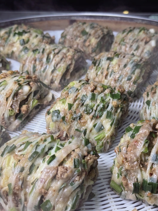 而最让人意外的,是多肉花卷的逆袭。原本只是搭配产品,如今却成了许多人专程而来的理由。花卷的肉馅铺得满满当当,面皮卷起时,肉末几乎要溢出来。