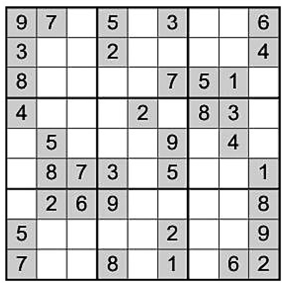 在空白格填入数字,使其每行、每列、每一个粗线格(3×3)内的数字为1~9,不重复。