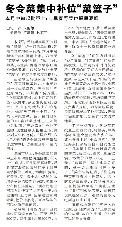本月中旬起,黑油桐、苏州青等本地冬令蔬菜集中批量上市,荠菜、马兰头、野葱等早春野菜也陆续登场。本地菜供应进入充足稳定期,带动蔬菜价格明显回落(《舟山晚报》11月25日报道)。一段时间来,不仅本地蔬菜大量上市补位“菜篮子”,香柚、橘子等本地水果也丰富着人们的味蕾,这正是:一方水土好收成,果蔬飘香润民生。