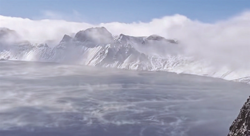 一是冷空气经过长白山时,会顺着火山口滑落到天池湖面上,在湖面形成一层较薄的冷空气层;
