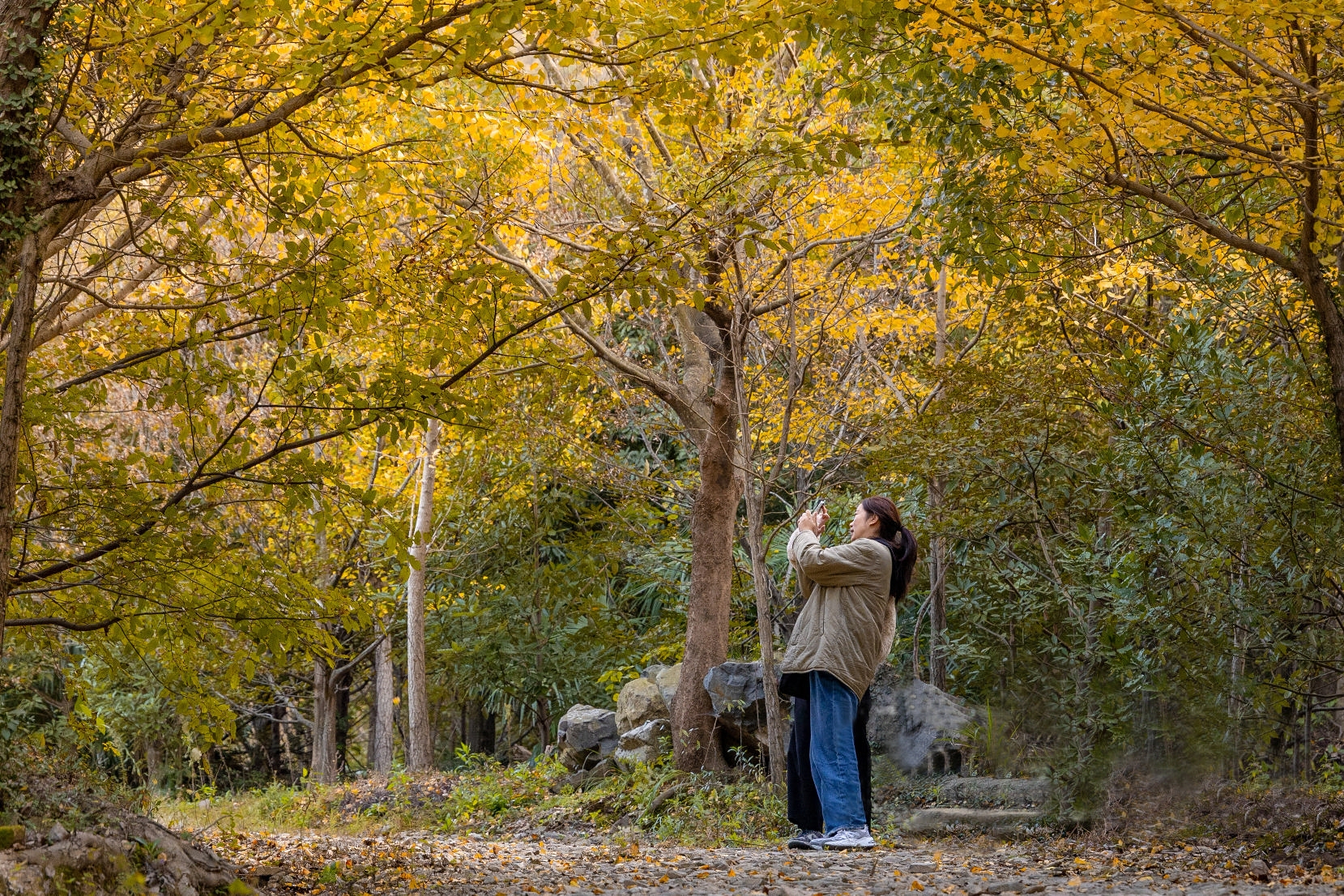 在东海百里文廊马岙段卧佛山,银杏尚未大面积褪去绿意,黄与绿在枝头交织出渐变的色调,十分惹眼。几名游客正踩着铺满金黄落叶的林间小道前来赏景。人群中,摄影爱好者用镜头捕捉光影之间的美丽瞬间。