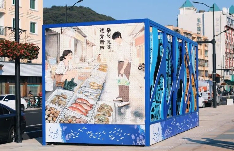 普陀城投以艺术为笔、乡情为墨,在沈家门滨港路的40多个冰冷工业铁壳上绘制出丰富多样的生活图景:有浓墨重彩的渔民画,蓝色大海层次分明,渔船破浪前行,渔民劳作场景栩栩如生,让人仿佛能听到渔民号子,闻到渔港气息;也有温情脉脉的市井风情长卷,吆喝卖货的商户、翻飞锅铲的妈妈、休闲时刻热聊的夫妻,凝固了最寻常珍贵的烟火人生。