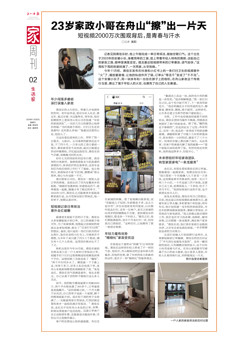23岁家政小哥在舟山“擦”出一片天