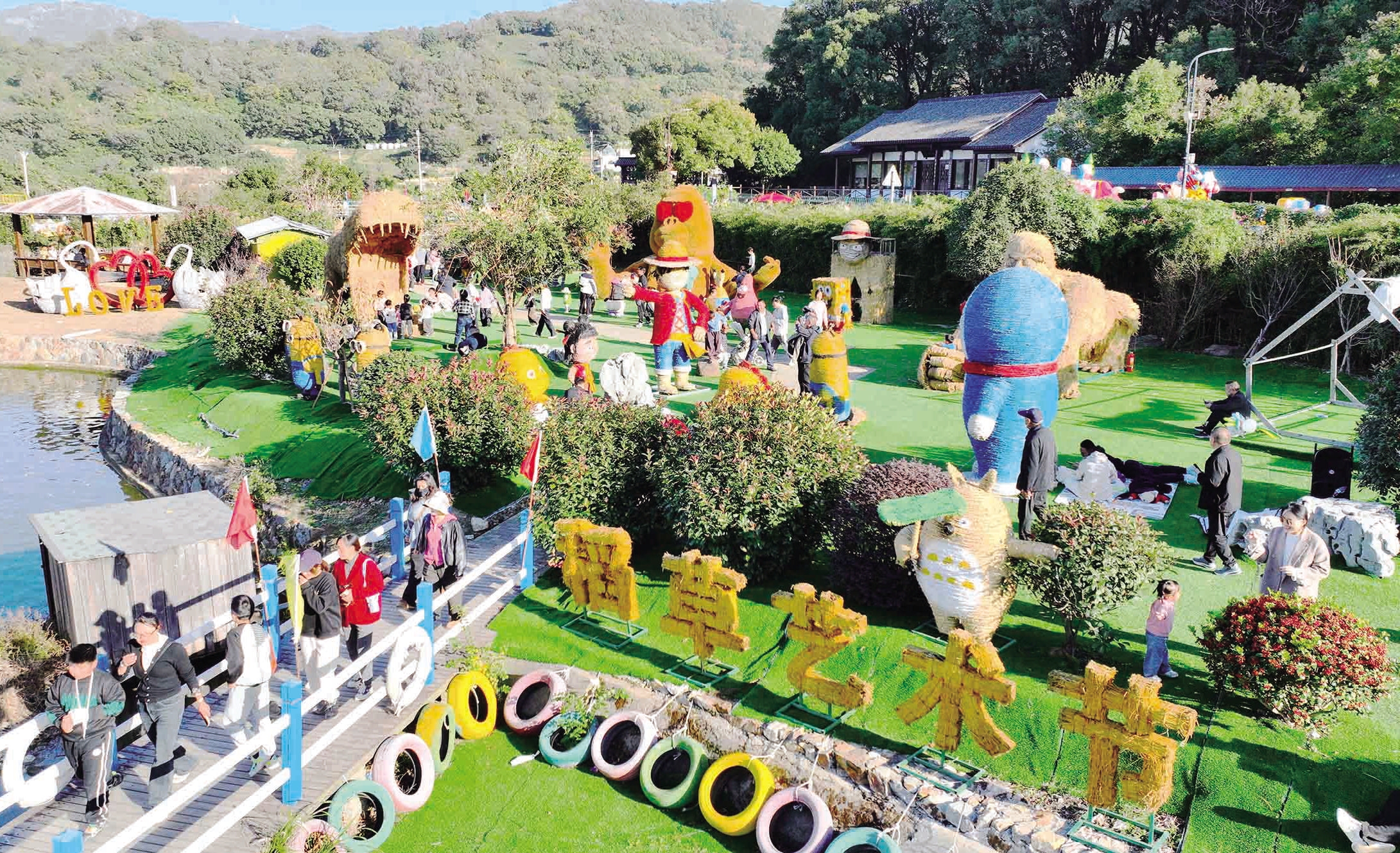 当日,该地欢乐主题稻草人艺术节在百鸟园开幕,海绵宝宝、蜡笔小新、海贼王、哆啦A梦等近20个稻草艺术作品亮相,人气旺盛。