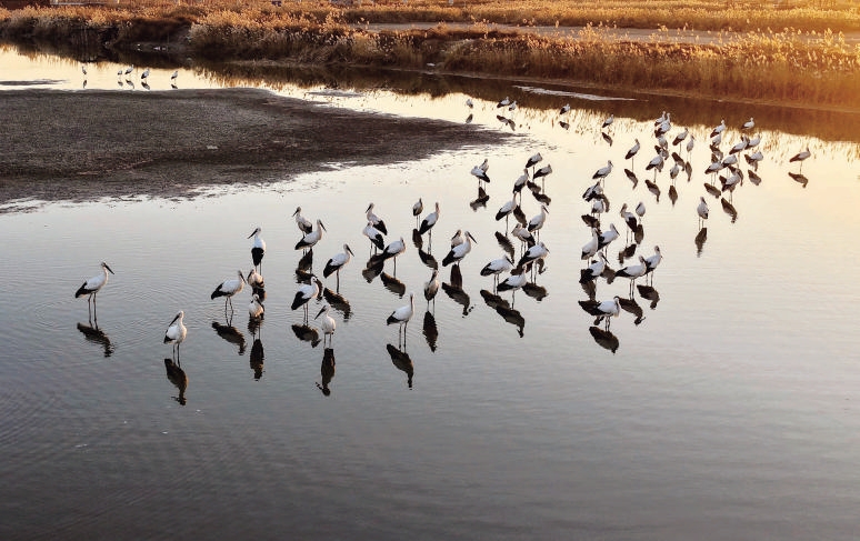 近日,大批东方白鹳飞抵河北省唐山市丰南区沿海湿地觅食、停留,形成一道靓丽的风景。
