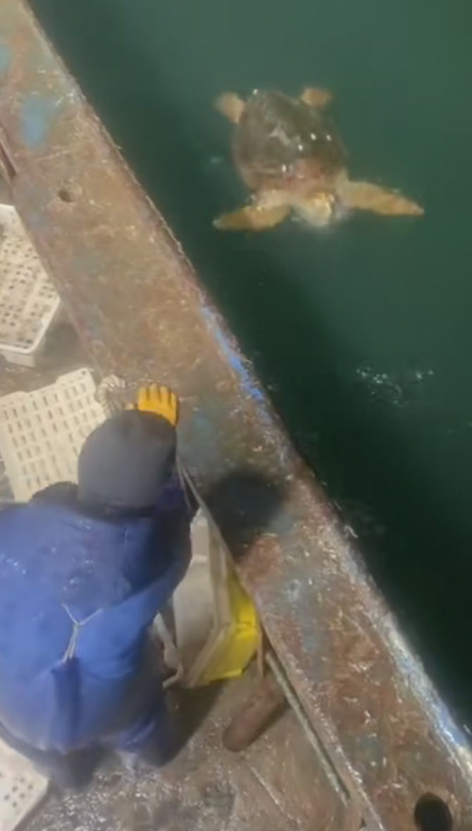原来,12月2日凌晨3点,姚方军带领船员在普陀海域开展扎网作业。“收网时感觉特别沉,起初以为是大丰收,拉上来一看吓了一跳。”姚方军回忆,网中裹着一只通体金黄色的大海龟,扑腾着四肢十分灵活。常年出海的他一眼便知这是保护动物,粗略估算体重足有50多公斤。