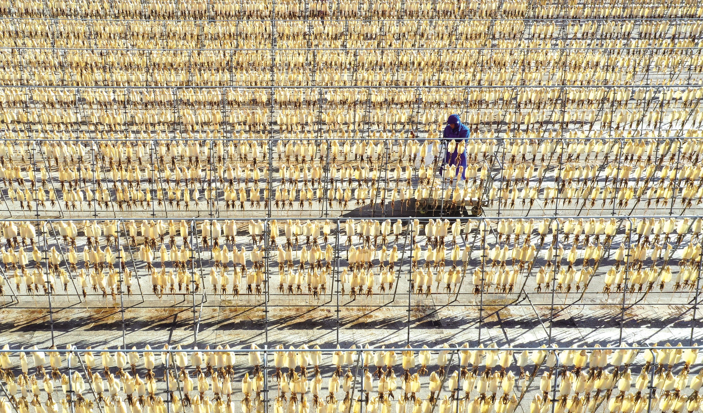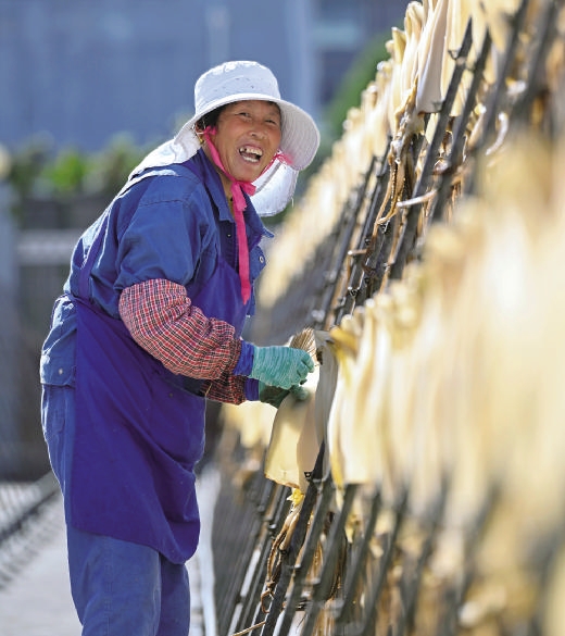 连日晴好天气迎来晒鲞好时节。近日,在普陀展茅街道的一个鱿鱼晒场,逆光下,大片正在晾晒的鱿鱼通体透亮,呈现出金黄光泽,宛如铺展开的“黄金帘幕”,工人们戴着遮阳帽穿梭其间,细致翻整、检查干度,与晒场共同勾勒出一幅独特的丰收图景。