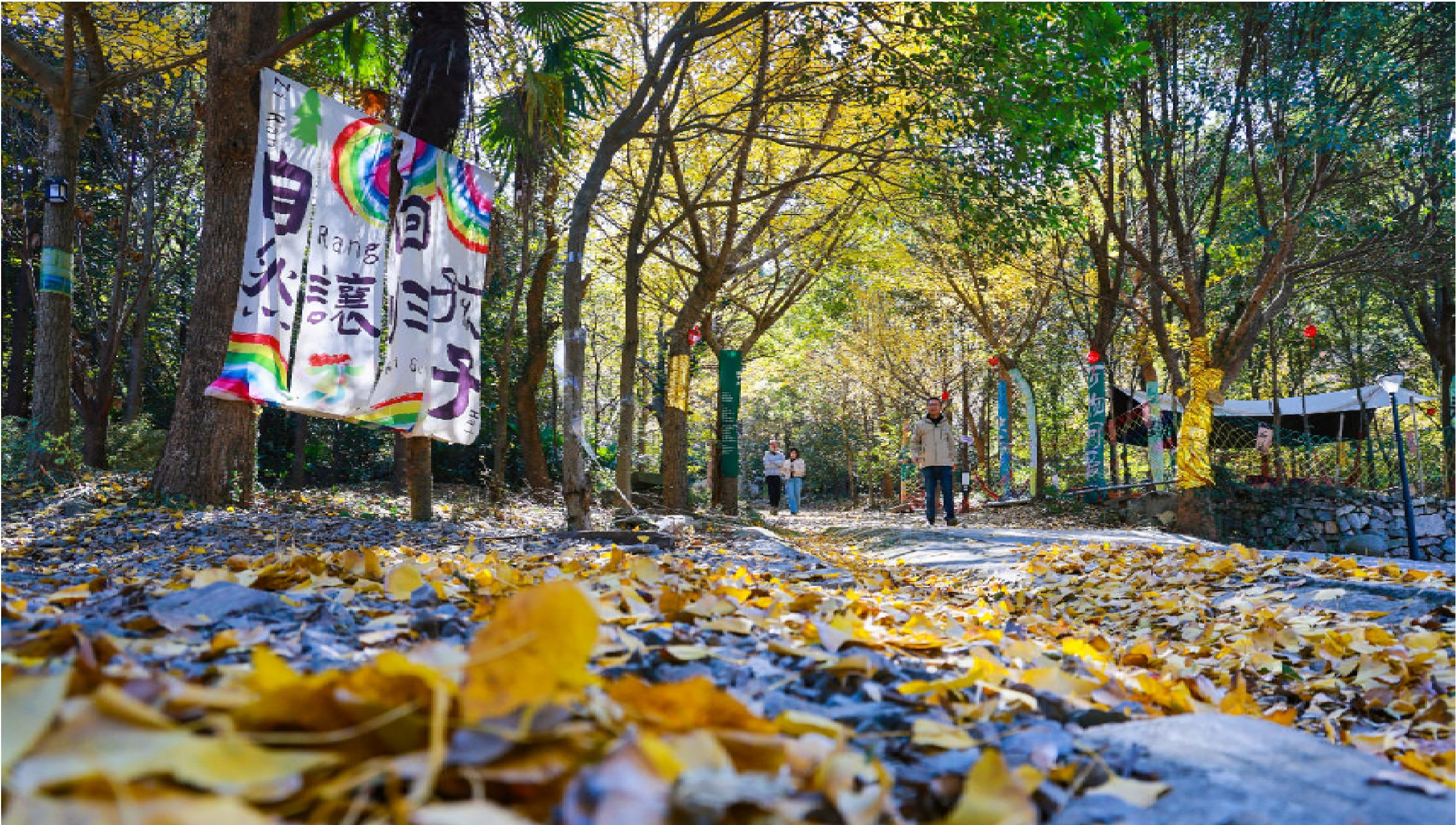 昨天,定海马岙卧佛山庄,阳光下银杏树发出金灿灿的光芒,又在地上投下斑驳的光影,与山路相映成趣。这正是一年中赏银杏的最佳时节。 记者 张磊 摄