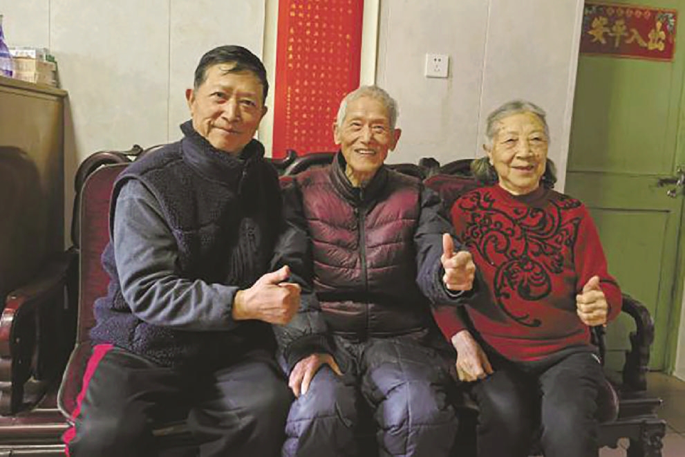 儿子胡建平(左)、老人胡先文(中)、沈惠君(右)
