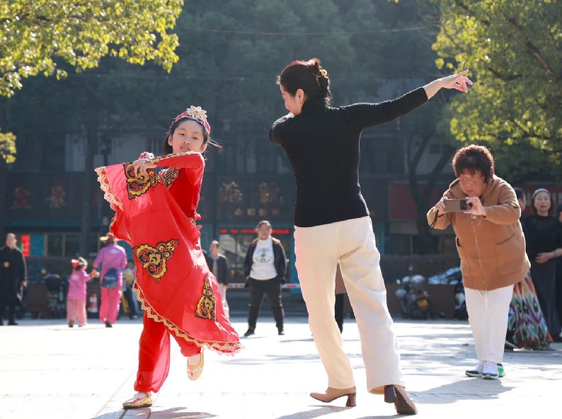 本报讯 昨天,定海海山公园,定海小学四年级学生赵梓涵身着特色服饰,与几位新疆舞爱好者一同翩翩起舞,灵动的表情、流畅的舞姿搭配明快的节奏,俨然成为公园中的“小明星”,引得过往市民纷纷驻足欣赏、拍照留念。
