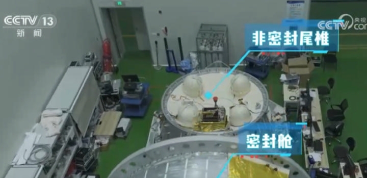 轻舟货运飞船由主体的一个密封舱和后段的一个非密封的尾椎构成。可以形象地想象成货车,就好像是一个大的密封箱以及后面一个皮卡的货斗,这样在这个密封舱里能够搭载很多精密设备仪器以及生活需要的物资。而在后面的这个开放的尾椎上,能够搭载很多其他的载荷。