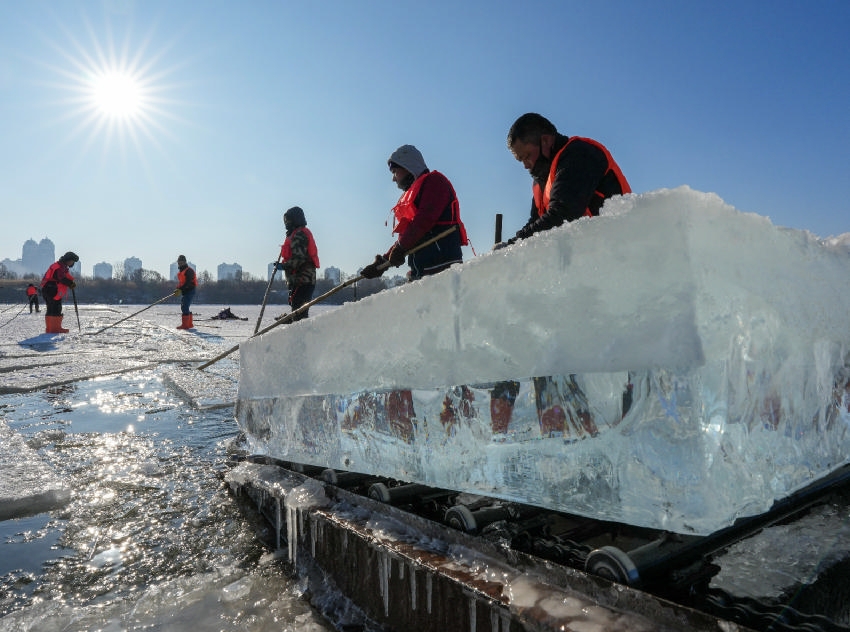 眼下,“冰城”哈尔滨采冰工作全面展开,采冰工人从松花江上采出优质冰料,源源不断地运往冰雪大世界园区等地,用于景观建设。