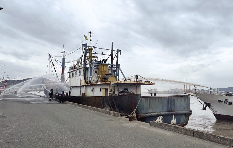 12月10日下午,岱山高亭镇中心渔港,岱山县海洋经济发展局组织开展今冬明春首场渔港渔船消防应急处置演练,通过模拟渔港油污收集点起火、停港渔船机舱失火两类典型险情,全面检验并提升渔港渔船应急处置能力。据悉,本次消防应急演练将覆盖全县所有渔港码头,持续至2026年4月30日。 记者 滕海平 通讯员 宋逸飞 摄