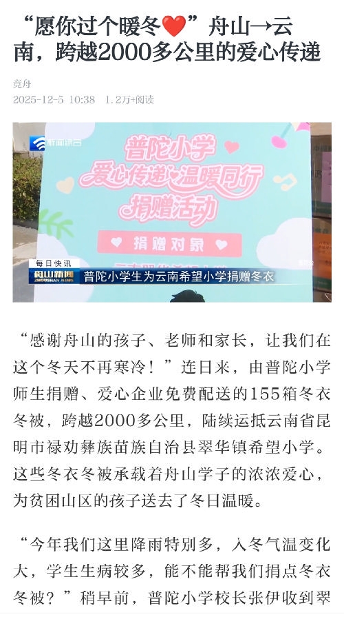 希望这份爱心能在千岛大地持续传递。当每一份微小善意汇聚成流,不仅能温暖远方的寒冬,更能让爱心与责任成为舟山最鲜明的城市底色。