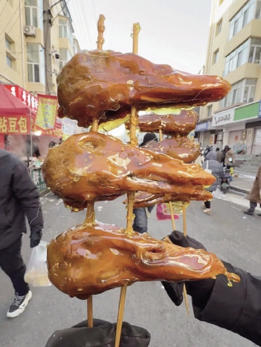 他们等了一会儿,让老板现做,也买了一串尝尝。老板告诉他们,现如今东北人喊南方游客改叫“南方小金豆”了,而这样的创新小吃很受“小金豆”欢迎,一天能卖出几百个鸭头。
