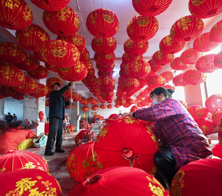 12月10日,工人在河北省石家庄市藁城区屯头村一家宫灯厂制作宫灯。