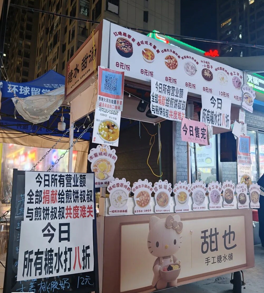 更令人动容的是,和张叔叔朝夕相处的“竞争对手”们也迅速行动起来,发出暖心回应。馄饨铺、糖水铺、养生茶铺、芋泥饼铺、海蛎饼铺……有人打折优惠送小食、送糖水,有人悄悄换上,张叔叔的收款码支援,整条街的摊主不约而同加入了这场爱的接力。