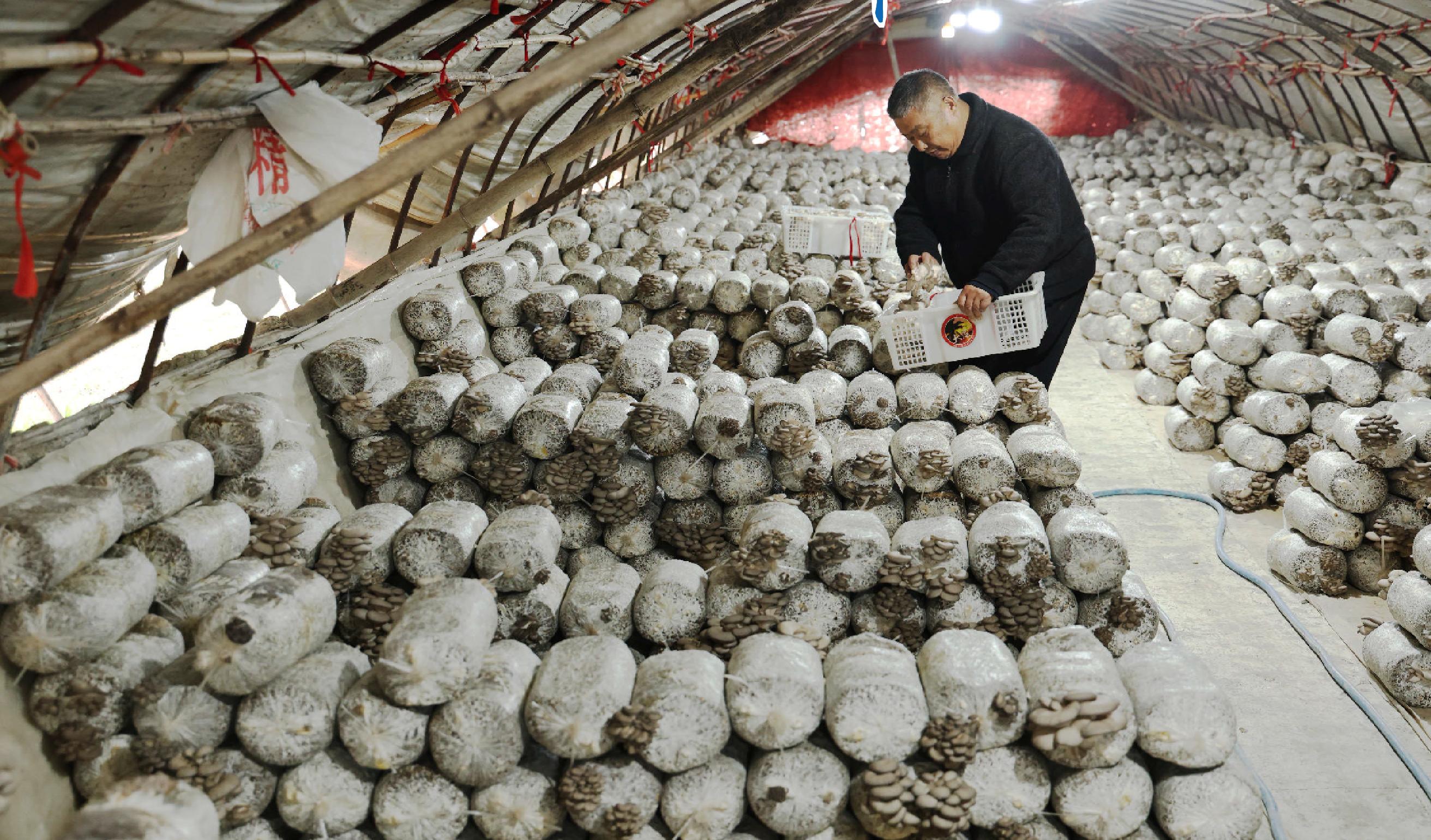 昨天,在定海区双桥街道石礁村姚义龙的食用菌种植大棚内,空气中散发着平菇的清香。排排菌棒整齐地码放着,一簇簇平菇破棒而出、长势喜人。种植户姚义龙正穿梭在菌棒间忙碌着采摘、装筐。据了解,目前,该种植户的头茬平菇迎来丰收季,共有4个大棚,计15000棒,日采摘量在100公斤左右,主要供应给附近市场,市场价每公斤16元,十分畅销。 记者 陈永建 摄