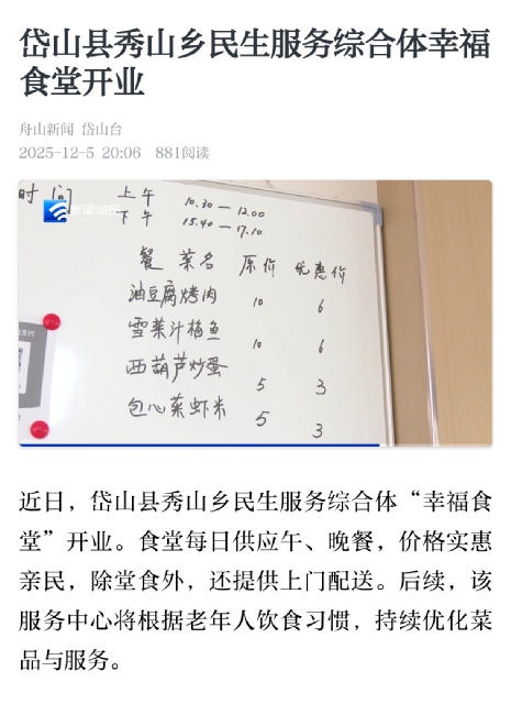 近日,岱山县秀山乡民生服务综合体幸福食堂正式投入运营,向当地群众尤其是老年人提供便捷、实惠的助餐服务(据《舟山晚报》12月10日报道)。