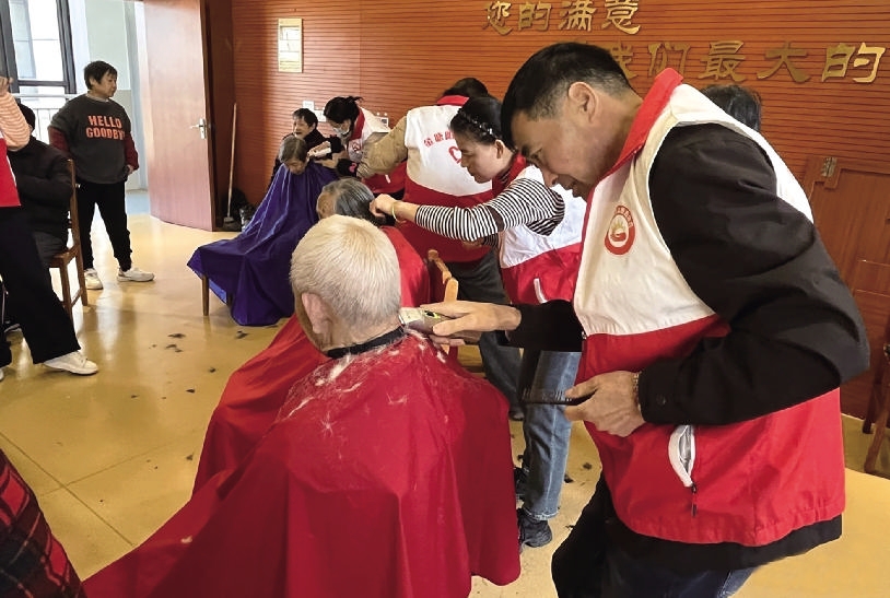 理发区域内,志愿者们手法娴熟,一边耐心征询老人的发型需求,一边细致修剪发丝;面对年迈行动不便、难以配合剃须的老人,志愿者们围在身旁耐心引导。“他们一来,我就打心底里高兴。”刚理完发的老伯满脸笑容地说。