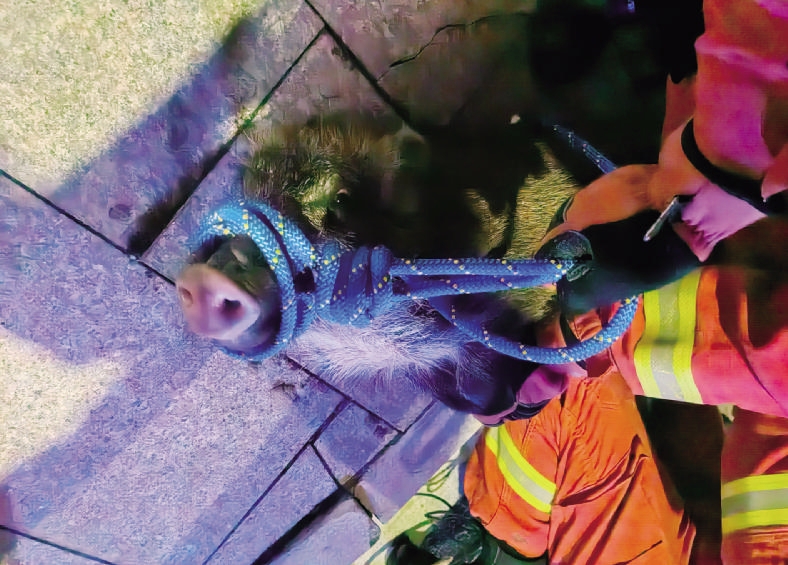 由于受惊过度,野猪跑到了三楼楼道后在楼内徘徊,野猪野性强且具攻击性,居民们心惊不已。而楼道狭窄、杂物较多,救援人员先疏散居民、设置警戒区域,随后预判野猪逃跑路线,制定围捕方案。4名消防队员默契配合,通过套索拦截、徒手控制、绳索捆绑等方式,用时5分钟最终在6楼楼梯成功制服这头误入小区的野猪,并用绳索牢牢绑住抬下楼。