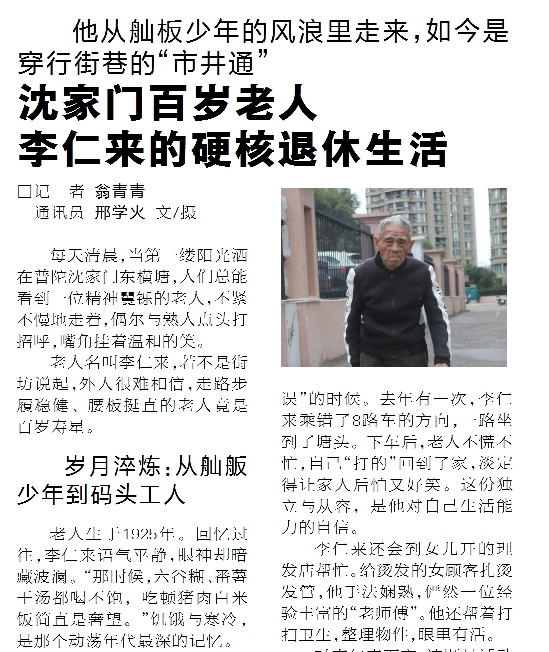 清晨,普陀沈家门东横塘的街巷刚刚苏醒。百岁老人李仁来缓步而行的身影,已是街坊心中一道熟悉的风景(《舟山晚报》12月16日报道)。生于1925年的他,用近一个世纪的生命,在不经意间回应着一个时代之问:当我们的城市日益步入老龄化,一个人该如何有尊严、有活力地度过晚年?