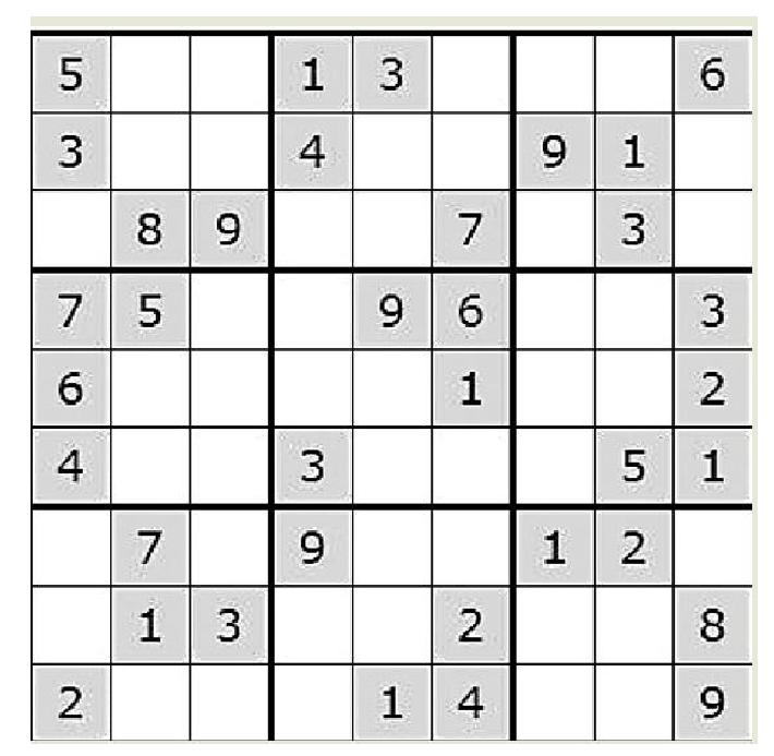在空白格填入数字,使其每行、每列、每一个粗线格(3×3)内的数字为1~9,不重复。