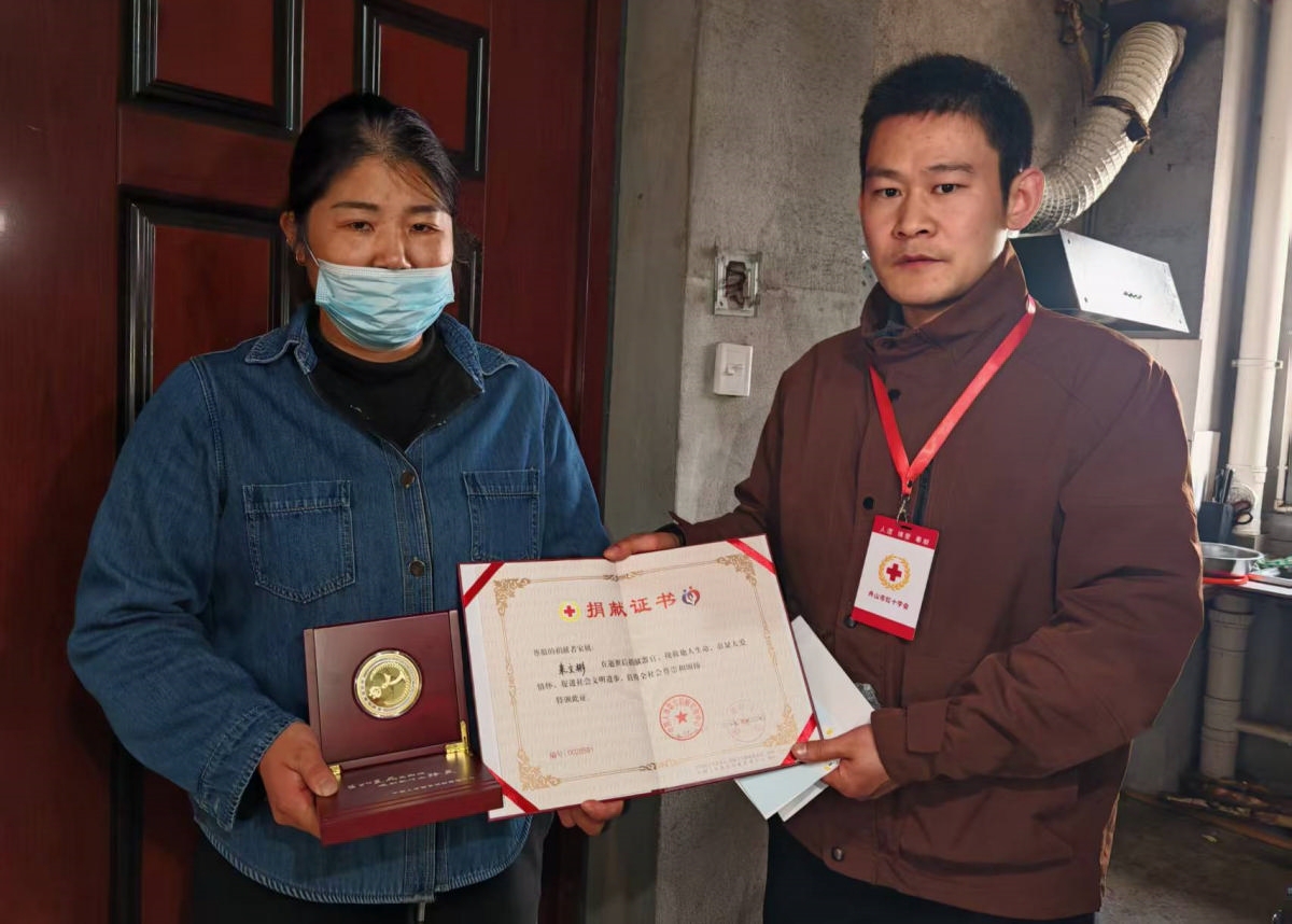 市红十字会的工作人员给李秀慧送来捐献证书