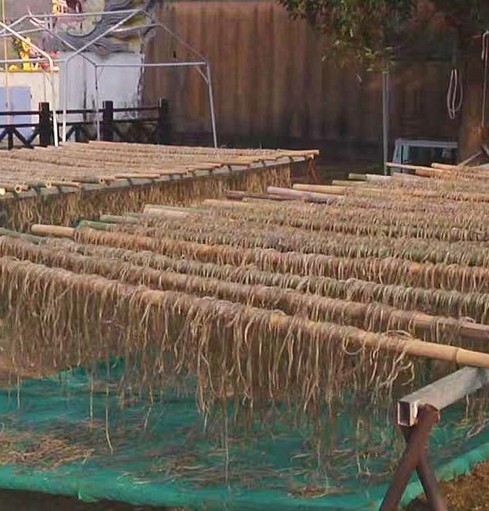据了解,衢山流干面的制作对红薯的品种较为讲究。每到年末,“东谷源”共富工坊都会统一收购附近村民种植的红薯,50公斤红薯能制成约6公斤的红薯淀粉。“今年天气干燥,淀粉原料的出粉量和质量都不错,去年粉丝做了4000多斤,流干面做了9000多斤,今年产量预计与去年基本一致。”“东谷源”共富工坊负责人郑海洋说。