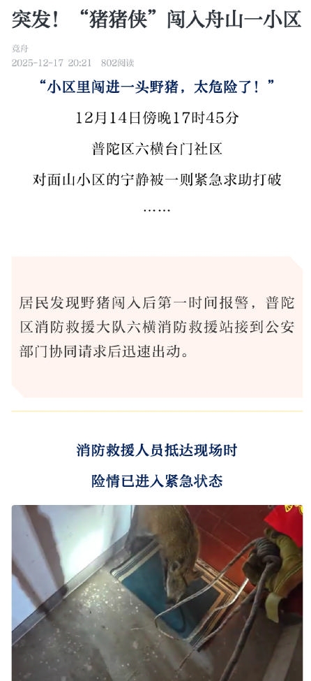 12月14日傍晚5时多,一头野猪闯入普陀区六横台门社区对面山小区,受惊后窜上了民宅楼道。闻讯而来的4名消防队员默契配合,通过套索拦截、徒手控制、绳索捆绑等方式,仅用5分钟就在6楼楼梯成功制服了这头误入小区的野猪(《舟山晚报》12月18日报道)。有惊无险,这场“捕猪大战”可谓精彩。