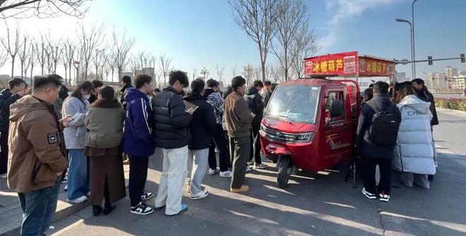 近日,在山东石油化工学院门口上演暖心一幕。众多大学生在寒风中排起了长队,只为买一串4元的糖葫芦,这是为啥?