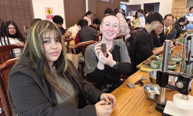 12月18日,“Hi,Young”中美青少年文化交流营走进浙江舟山群岛新区旅游与健康职业学院。双方互赠具有海洋特色与加州风情的礼物。美国青少年还体验了中国书法、舟山渔民画、香道与香囊制作,并在学生乐队的中国风表演中感受文化共鸣。活动在青春共鸣与沉浸体验中,书写了跨越太平洋的友谊新篇章。