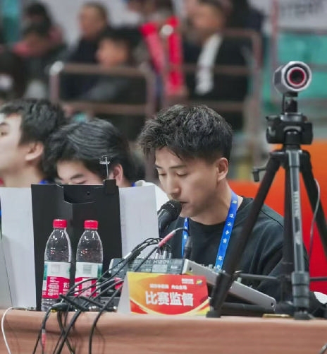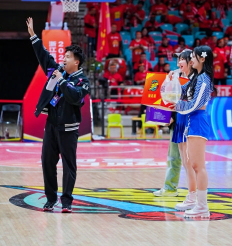 12月18日晚,舟山体育馆内,浙江省城市篮球联赛(浙BA)舟山队与金华队激战正酣。观众席上座无虚席,欢呼声、呐喊声、助威声如海浪般此起彼伏。而在场边,一个手持麦克风的身影格外引人注目——他时而带领全场高喊防守口号,时而用充满激情的解说点燃现场气氛。
