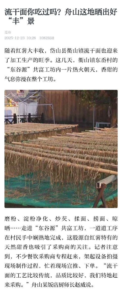 随着红薯大丰收,岱山县衢山镇流干面也迎来了加工生产的旺季。不少餐饮采购商专程赶来,架起设备拍摄现场制作过程,忙着宣推、下单,这份“衢山味道”正从海岛小院走向长三角百姓的餐桌(《舟山晚报》12月23日报道)。