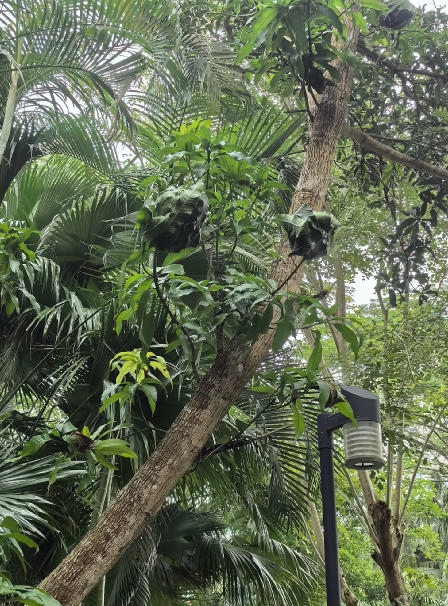 餐后散步,漫无目的,忽被行道树上两个碧绿的“叶团”“打眼”。