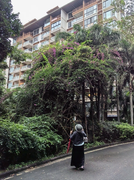 转身离去时,发现斜对面有位女士也在拍。不过她拍的不是树叶,而是一树寥落稀疏的紫红色三角梅。