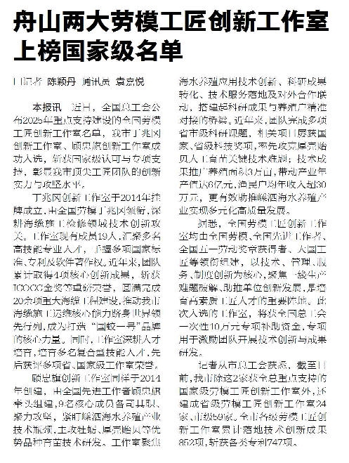 近日,全国总工会公布2025年重点支持建设的全国劳模工匠创新工作室名单,我市丁兆冈创新工作室、顾忠旗创新工作室成功入选,斩获国家级认可与专项支持,彰显我市顶尖工匠团队的创新实力与攻坚水平《舟山晚报》(12月26日报道)。