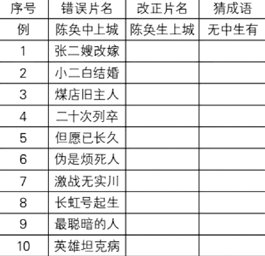 这是一道妙趣横生的文字游戏,已知图表中的错误片名中,每部影片名都有一个错字,请你改正片名后,根据意思填出一句成语。