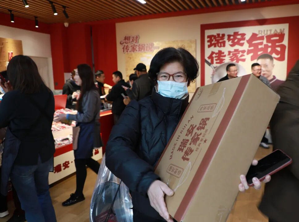 10时许,瑞安·传家名品馆正式对外试营业,首批20名市民率先进店选购。家住大沙堤的贾英秋是首位线下购得传家锅的市民。接过锅具,他仔细端详、掂量,脸上露出满意的神情:“锅好不好,经常下厨的人一上手就有感觉。瑞安‘传家锅’有专利,做工看得出精细,我中午就炒几个菜检验一下。”