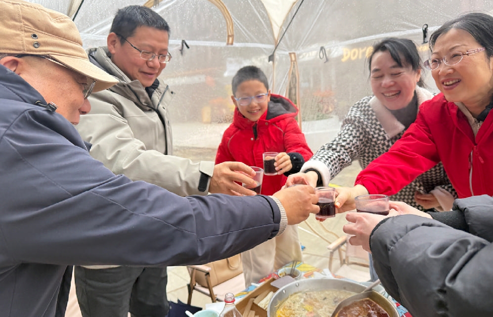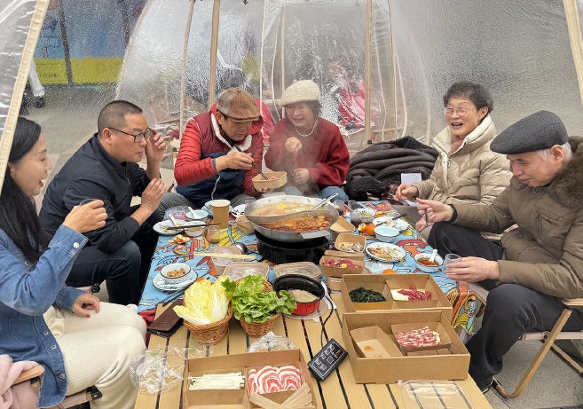 透明帐篷内热气缭绕,氤氲之间,碗筷轻碰声、谈笑声与火锅冒着热气的咕嘟声交织成一片。几位环卫工人举起手机,小心地避开蒸汽,欢喜地对着满桌的鱼虾海鲜、牛羊肉、蔬菜拼盘等拍下照片。这群节日期间依然坚守岗位、维护城市整洁的城市美容师,此刻已暂时卸下疲惫,坐在这里轻松享用火锅宴。
