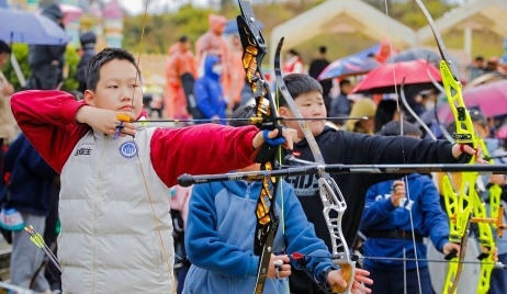 在舟山儿童公园外广场,学生正在参与2026年舟山市青少年射箭校际对抗赛