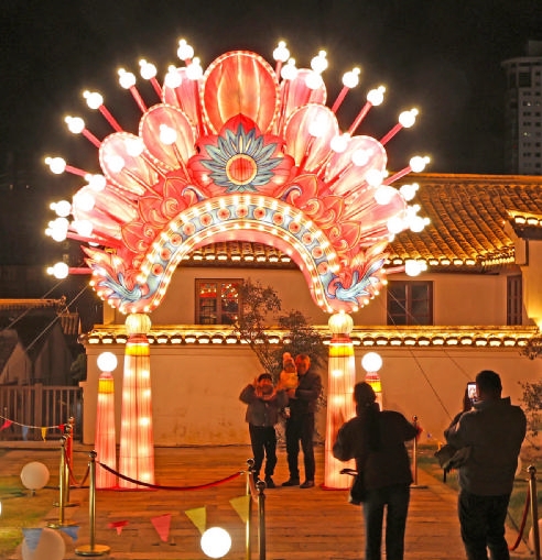 定海古城,几位市民正在彩灯前留影