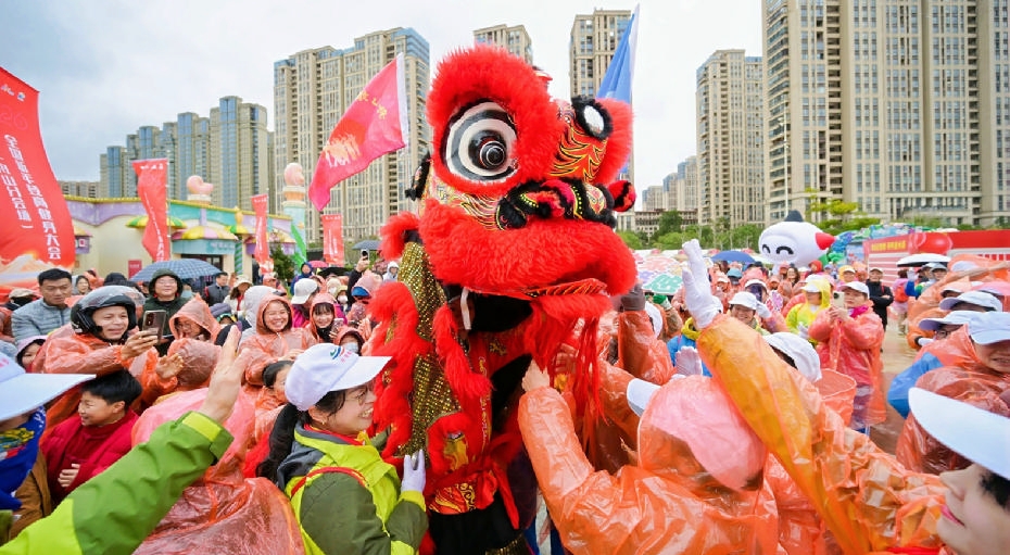 位于新城的舟山儿童公园南广场,舞狮表演与市民互动