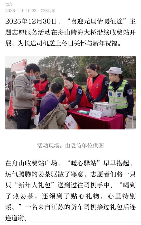 新年来临之际,一场“喜迎元旦、情暖征途”主题志愿服务活动也在舟山跨海大桥沿线收费站开展,为长途司机送上冬日关怀与新年祝福。环卫工人、长途司机,以及所有在节日里坚守岗位的人,都应该被惦记、都应该受优待。致敬劳动者,既是一种感恩之心,也是一种情感共鸣。在过去的一年,每一个辛勤劳作的人都了不起,大家也应该为自己干一杯。