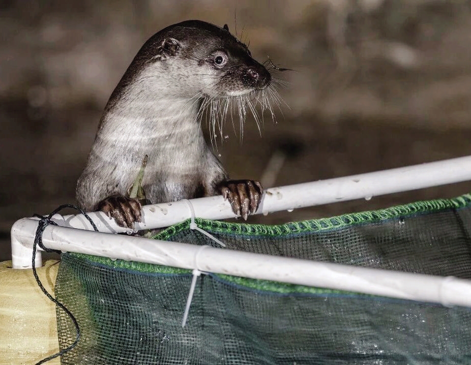 金塘岛因栖息着稳定的欧亚水獭种群,成为浙江省水獭保护关键栖息地。历史上,水獭捕食养殖鱼类的习性,构筑起“人獭共存”基础,但人獭争食的矛盾也长期存在。为破解这一难题,保护团队在地方政府支持下,创新打造“水獭爱心鱼塘”和“水獭食堂”双轨保护模式。其中“水獭食堂”由闲置虾塘改造而成,兼具科研监测与生态科普双重功能。