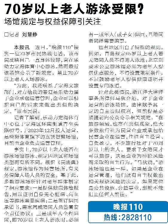 近日,我市乐动力定海体育中心的一则规定引发关注:禁止70岁以上老人入场游泳。一位常年在此锻炼、身体健康的七旬老人因此被拒之门外(《舟山晚报》1月6日报道)。此事折射出在老龄化社会背景下,企业经营自主权、公共安全责任与老年人健身权益之间如何平衡的新课题。