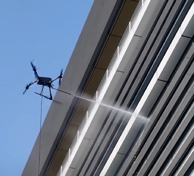 无人机“飞檐走壁”清洁嵊泗体育馆