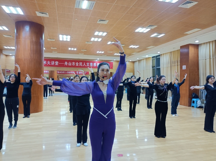 像是摸着石头过河,她尝试了拉丁、摩登、芭蕾、肚皮舞……什么都学。当时她还住在沈家门的金鹰海景小区,晚上常一个人在小区的空地上,对着手机视频练习舞蹈。起初,邻居只是远远地看着,渐渐地,有人开始跟着比划。也许这就是女性的天性,无论什么年纪,心里都藏着对美的向往。