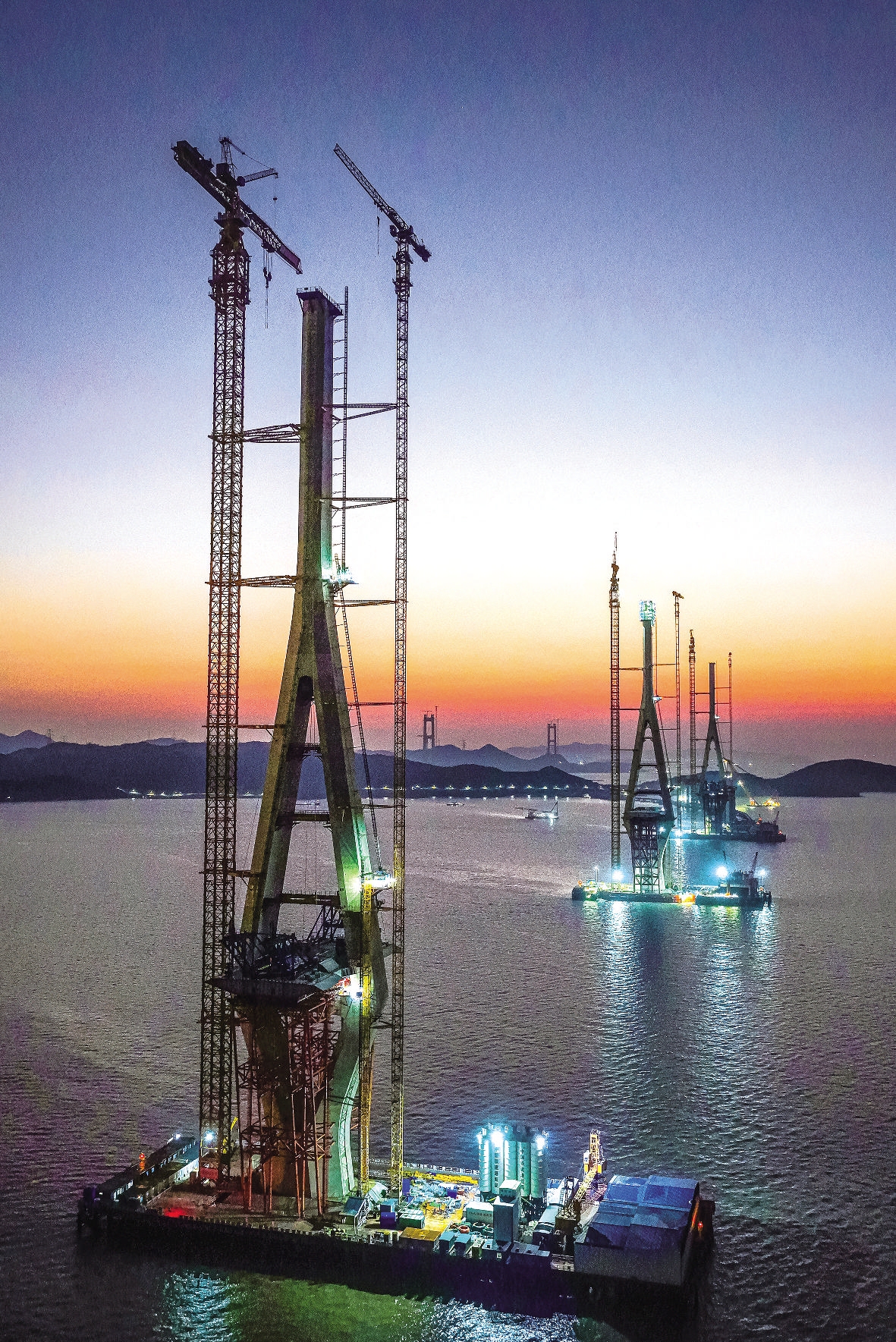 昨天凌晨,宁波舟山港六横公路大桥二期工程——青龙门特大桥Q4主塔顶上,建设工人迎着朝阳在249米高的作业平台上进行封顶浇筑施工准备。当天下午5时半,随着最后一方混凝土浇筑完成,这座世界最大跨度三塔钢箱梁斜拉桥三座钻石型主塔全部完成封顶,正式从“立塔成型”阶段迈入“斜拉成桥”的关键施工期。据悉,青龙门特大桥连接宁波梅山岛与舟山佛渡岛,全长5.864公里,其通航孔桥全长2212米。
