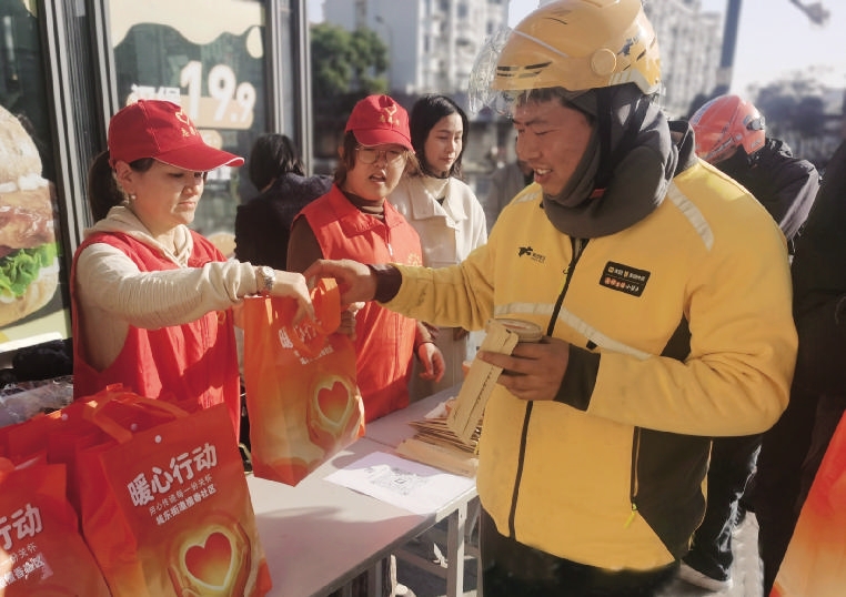 本报讯 昨天上午,定海城东街道檀香社区开展“以冬之暖,馈城之速”小哥友好活动,为快递小哥、外卖骑手等新就业群体送上热粥与冬日礼包。